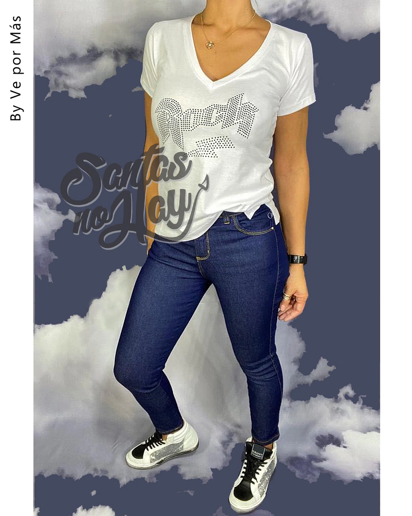 Remera de jersey de algodón peinado premium, de corte adaptable, manga corta con doblez. Cuello escote en V con pespunete de recta . aplique importado.